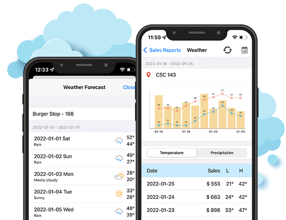 Integrated weather details and forecast allows you to see outside factors that affect your business.